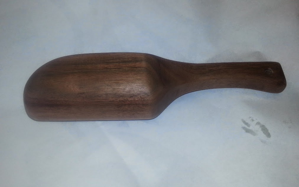As other in the wood working community have seen several You Tube sites sharing their method of making these scoops. My favorate site I went to was Jays Custom Creations. His simple ideas for such practical projects has always interested me. This project is mainly made using a band saw and a sanding disc. I made this out of walnut. I started with a 2.5 x 2.5 inch square x 5 inches long piece. Here is the link to Jays video of how he made his. https://www.youtube.com/watch?v=06PJQFXAT24&list=UU-7XY-W_C84cW2MNqujgFpg